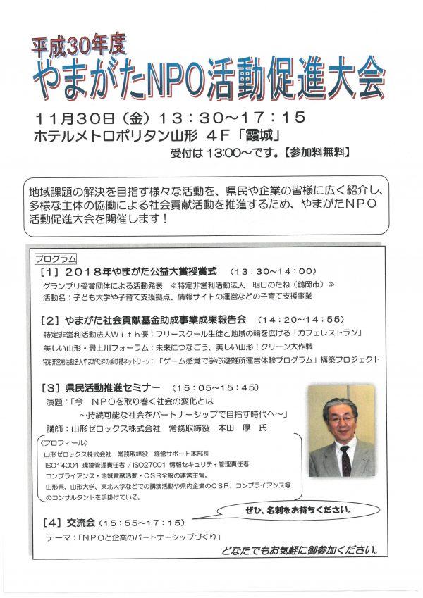 « すべてのイベント このイベントは終了しました。 平成30年度やまがたNPO活動促進大会 2018年11月30日13:30 - 17:30 « 【チェリア・ファーラ講座②】知ろう!防ごう!ハラスメント~パワハラ・モラハラ・セクハラなど~ 2018やまがたNPOウィーク » チラシはこちらからダウンロードできます(PDF形式) + Google カレンダー+ iCal エクスポート 詳細 日付: 2018年11月30日 時間: 13:30 - 17:30 イベントカテゴリー: 団体主催 主催者 山形県(山形県観光文化スポーツ部 県民文化スポーツ課) 電話番号: 023-630-3157 会場 ホテルメトロポリタン山形 3階 「出羽」 山形市香澄町1-1-1 + Google マップ 電話番号: 023-628-1111
