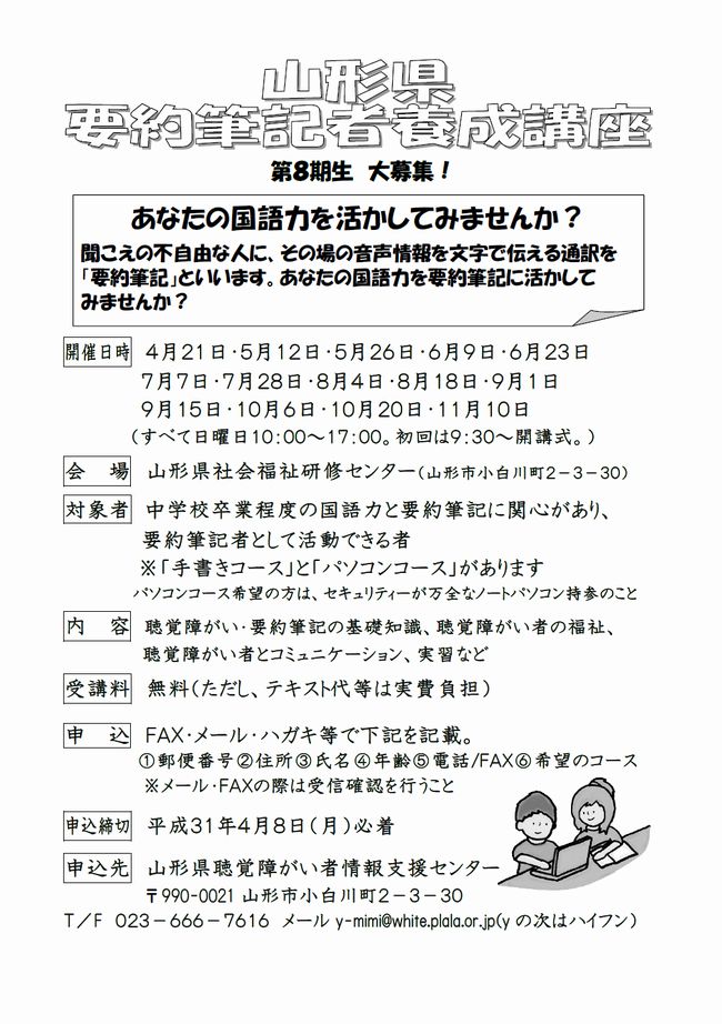 « すべてのイベント このイベントは終了しました。 第8期山形県要約筆記者養成講座 2019年10月6日10:00 - 17:00 « 福祉のまちづくりフェア2019 集まれ!山形ママ!パパ!子どもたち!やまがた家族力アップデー » ・チラシPDFデータは、こちらからダウンロードすることができます ・開催要綱PDFデータは、こちらからダウンロードすることができます + Google カレンダー+ iCal エクスポート 詳細 日付: 2019年10月6日 時間: 10:00 - 17:00 イベントカテゴリー: 団体主催 主催者 山形県聴覚障がい者情報支援センター 電話番号: 023-666-7616 会場 山形県社会福祉研修センター 小白川町2-3-30 山形市, + Google マップ