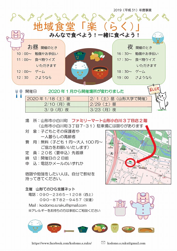 « すべてのイベント このイベントは終了しました。 子ども食堂・地域食堂「楽(らく)」 2020年2月10日16:30 - 19:00 « たまりば★カフェにどうぞ! 小正月の行事 おさいとう » チラシはこちらからダウンロードできます(PDF形式) + Google カレンダー+ iCal エクスポート 詳細 日付: 2020年2月10日 時間: 16:30 - 19:00 イベントカテゴリー: 団体主催 主催者 山形てのひら支援ネット 電話番号: 080-3192-5915(岡部) メール: kodomo.s.raku@gmail.com Web サイト: https://www.facebook.com/kodomo.s.raku/ 会場 山形市小白川町ファミリーマート山形小白川3丁目店2階 山形市小白川町3丁目7-31 + Google マップ
