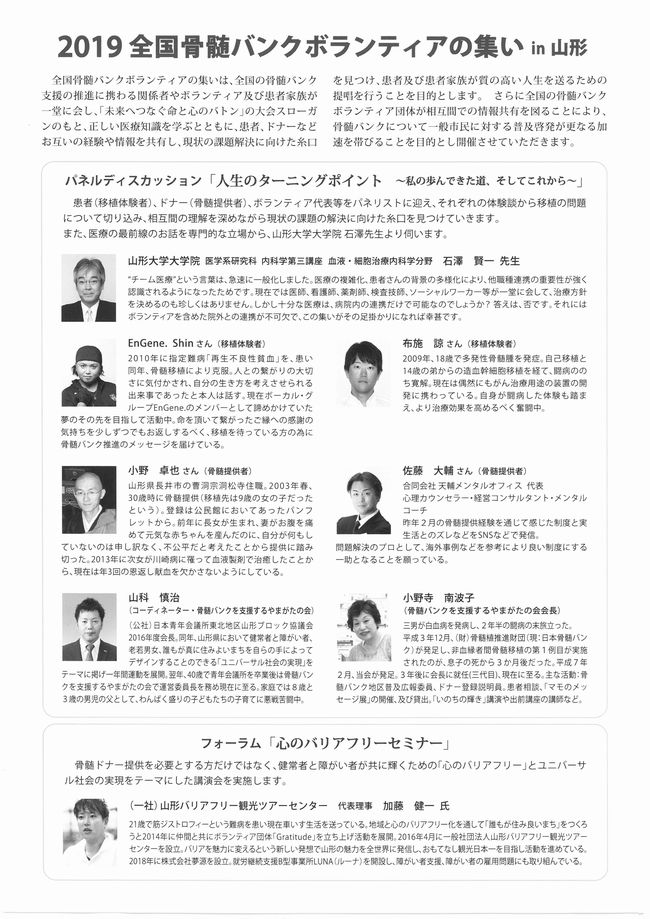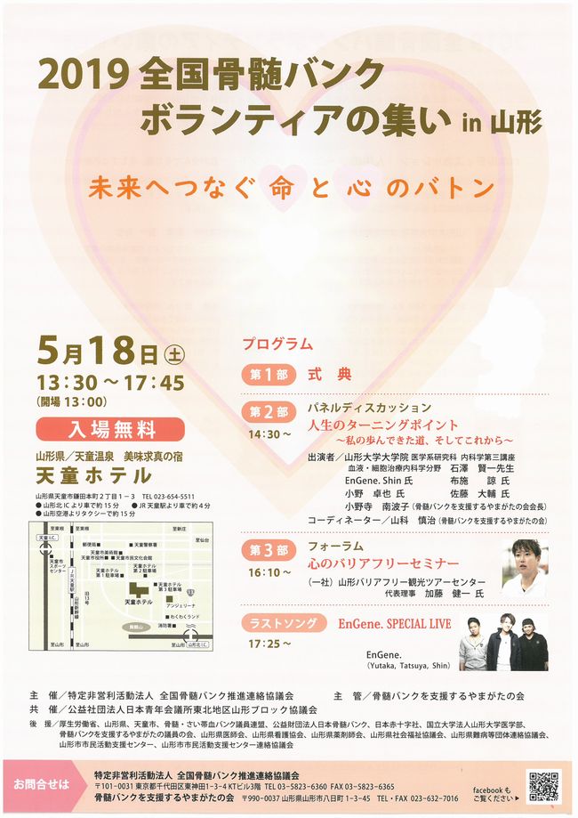 « すべてのイベント このイベントは終了しました。 2019全国骨髄バンクボランティアの集い in 山形 2019年5月18日13:30 - 17:45 « あいらぶ末広楽市楽茶 第9回 東日本大震災チャリティーコンサート ~祈りを音にこめて~ » ・チラシPDFデータは、こちらからダウンロードすることができます + Google カレンダー+ iCal エクスポート 詳細 日付: 2019年5月18日 時間: 13:30 - 17:45 イベントカテゴリー: 団体主催 Web サイト: https://www.facebook.com/events/775235809517863/ 主催者 特定非営利活動法人 骨髄バンク推進連絡協議会 電話番号: 03-5823-6360 会場 天童ホテル 鎌田本町2丁目1-3 天童市, + Google マップ