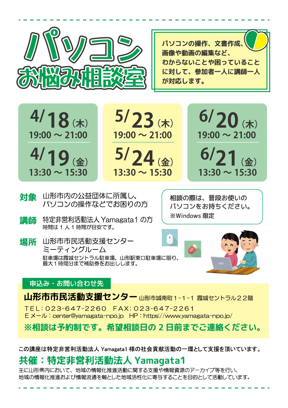 « すべてのイベント このイベントは終了しました。 パソコンお悩み相談室 2019年6月20日19:00 - 21:00 « 安全登山始めよう!山ガール・山ボーイも集まれ!葉っぱ塾・安全登山入門編2019 気持ちが伝わるビジネスメール講座 » チラシはこちらからダウンロードできます(PDF形式) + Google カレンダー+ iCal エクスポート 詳細 日付: 2019年6月20日 時間: 19:00 - 21:00 イベントカテゴリー: センター主催 主催者 山形市市民活動支援センター 電話番号: 023-647-2260 Web サイト: https://www.yamagata-npo.jp/ 会場 山形市市民活動支援センター ミーティングルーム