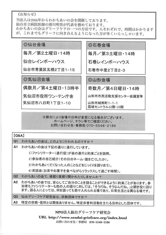 « すべてのイベント このイベントは終了しました。 大切な人を亡くした方のためのわかちあいの会 2019年5月26日14:00 - 16:30 無料 « さんさんフリーマーケット 子ども食堂・地域食堂「楽(らく)」 » チラシはこちらからダウンロードできます(PDF形式) + Google カレンダー+ iCal エクスポート 詳細 日付: 2019年5月26日 時間: 14:00 - 16:30 参加費: 無料 イベントカテゴリー: 団体主催 Web サイト: https://sendai-griefcare.jp/%E3%82%8F%E3%81%8B%E3%81%A1%E3%81%82%E3%81%84%E3%81%AE%E4%BC%9A%e3%80%80%E5%B1%B1%E5%BD%A2%E4%BC%9A%E5%A0%B4-5-26/ 主催者 NPO法人仙台グリーフケア研究会 電話番号: 070-5548-2186 メール: griefoffice@gmail.com Web サイト: https://sendai-griefcare.jp/ 会場 山形市市民活動支援センター ふらっと + 会議室B 山形県山形市城南町1-1-1-22F + Google マップ 電話番号: 023-647-2260 Web サイト: https://www.yamagata-npo.jp/