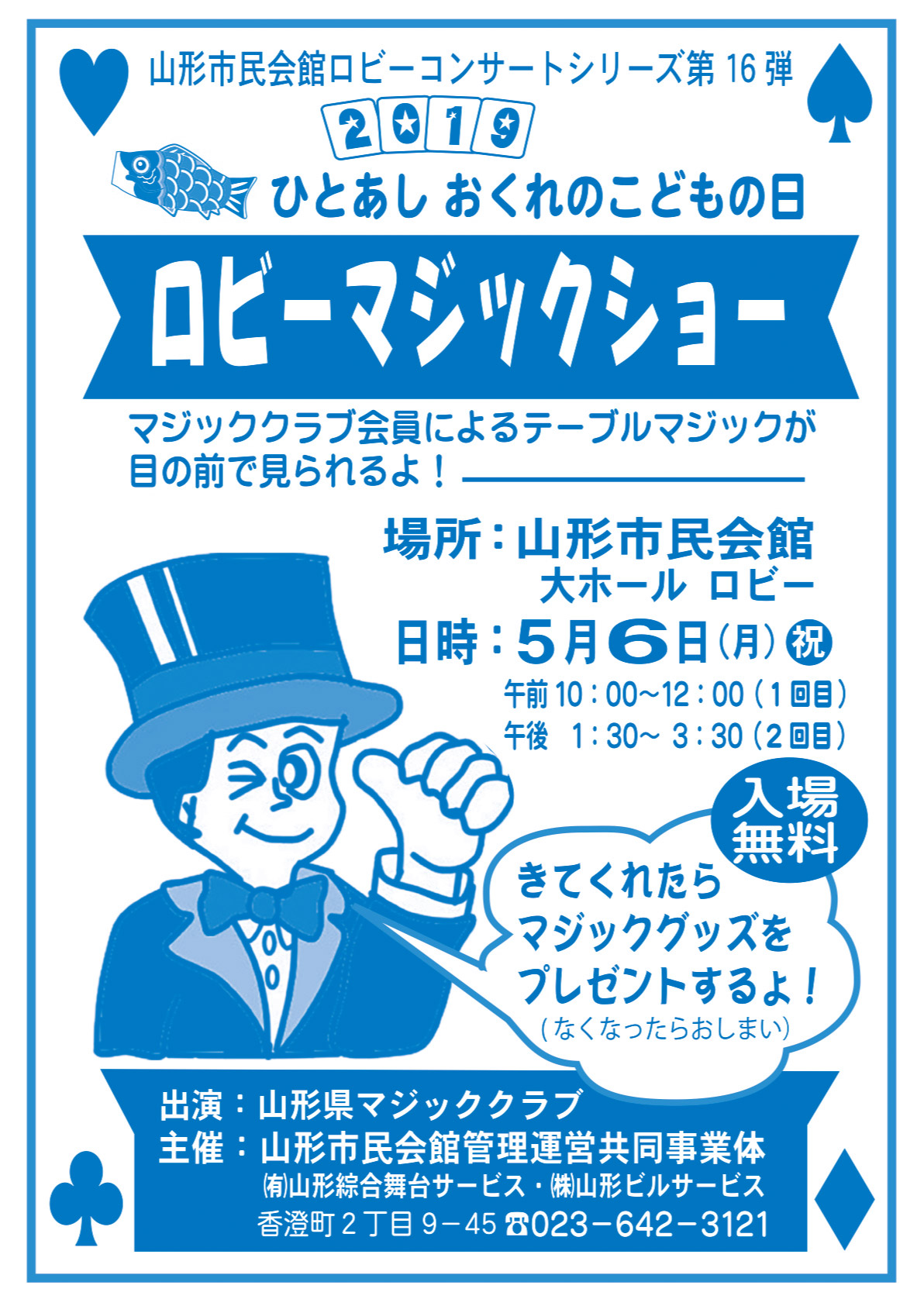 « すべてのイベント このイベントは終了しました。 ひとあしおくれのこどもの日「ロビーマジックショー」 2019年5月6日10:00 - 15:30 « 第13回 大森林祭 山形尺八倶楽部ライブコンサート » チラシはこちらからダウンロードできます(PDF形式) + Google カレンダー+ iCal エクスポート 詳細 日付: 2019年5月6日 時間: 10:00 - 15:30 イベントカテゴリー: 団体主催 Web サイト: https://www.shanshanshan.jp/event/%E3%81%B2%E3%81%A8%E3%81%82%E3%81%97%E3%81%8A%E3%81%8F%E3%82%8C%E3%81%AE%E3%81%93%E3%81%A9%E3%82%82%E3%81%AE%E6%97%A5%E3%80%8C%E3%83%AD%E3%83%93%E3%83%BC%E3%83%9E%E3%82%B8%E3%83%83%E3%82%AF%E3%82%B7/ 主催者 山形市民会館管理運営共同事業体 会場 山形市民会館 山形市香澄町 2-9-45 + Google マップ Web サイト: https://www.shanshanshan.jp/