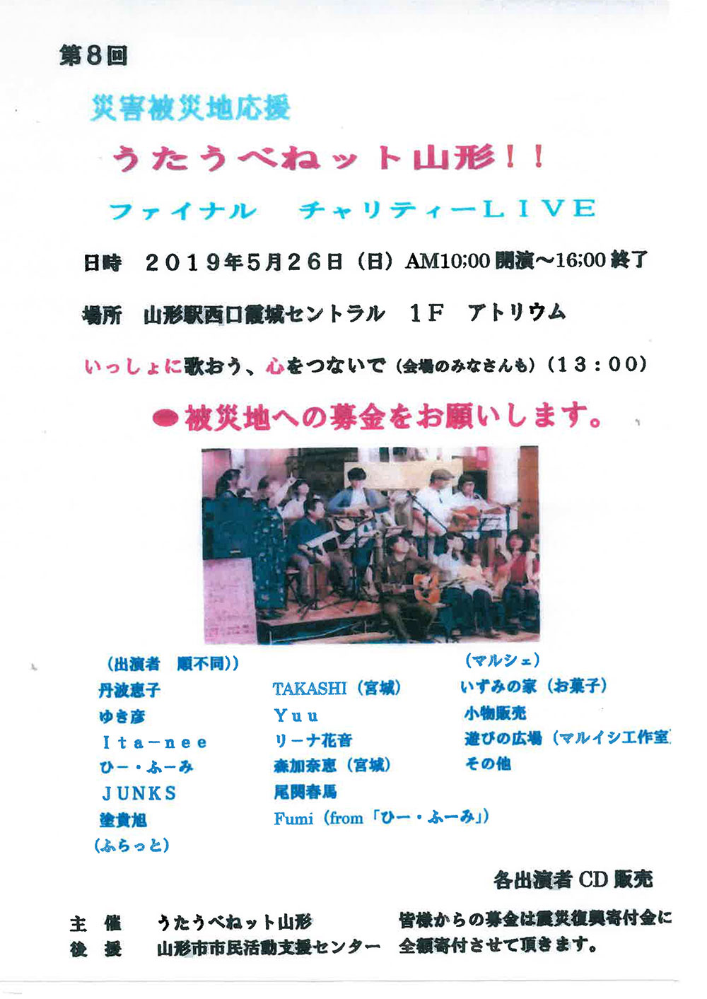 « すべてのイベント このイベントは終了しました。 第8回うたうべねット山形!!ファイナル チャリティーLIVE 2019年5月26日10:00 - 16:00 « 第8期山形県要約筆記者養成講座 さんさんフリーマーケット » チラシはこちらからダウンロードできます(PDF形式) + Google カレンダー+ iCal エクスポート 詳細 日付: 2019年5月26日 時間: 10:00 - 16:00 イベントカテゴリー: 団体主催 主催者 うたうべねット山形 会場 霞城セントラル1階アトリウム 城南町1‐1‐1 山形市, + Google マップ