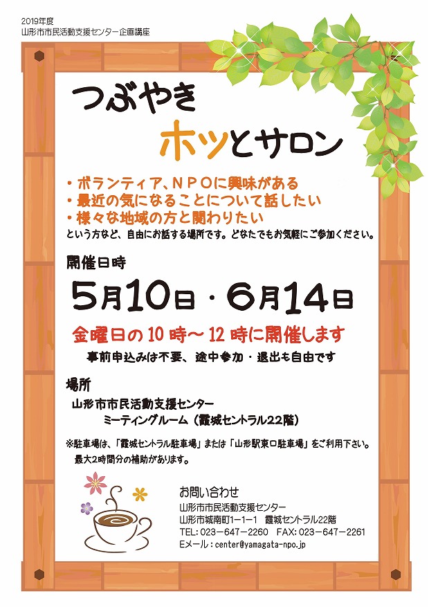« すべてのイベント このイベントは終了しました。 つぶやきホッとサロン 2019年6月14日10:00 - 12:00 « 仕事理解セミナー リア塾~キックオフ☆パーティー~ » チラシはこちらからダウンロードできます(PDFデータ) + Google カレンダー+ iCal エクスポート 詳細 日付: 2019年6月14日 時間: 10:00 - 12:00 イベントカテゴリー: センター主催 主催者 山形市市民活動支援センター 電話番号: 023-647-2260 Web サイト: https://www.yamagata-npo.jp/ 会場 山形市市民活動支援センター ミーティングコーナー