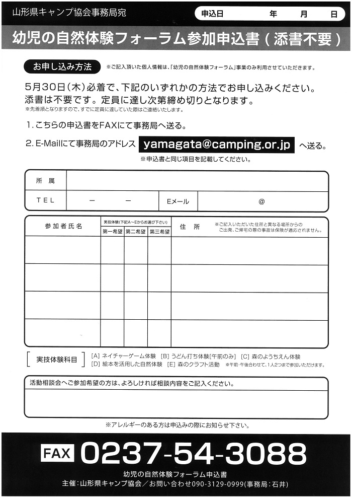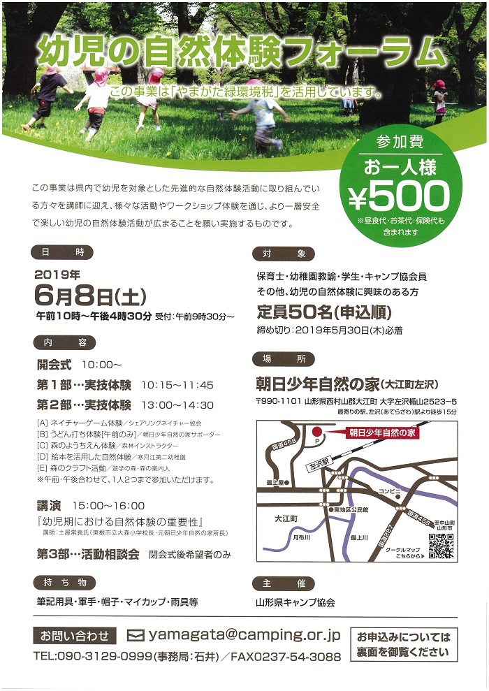 « すべてのイベント このイベントは終了しました。 幼児の自然体験フォーラム 2019年6月8日10:00 - 16:30 ¥500 « 子育て支援者養成講座 おやコミカフェ » チラシはこちらからダウンロードできます(PDF) + Google カレンダー+ iCal エクスポート 詳細 日付: 2019年6月8日 時間: 10:00 - 16:30 参加費: ¥500 イベントカテゴリー: 団体主催 主催者 山形県キャンプ協会 電話番号: 090-3129-0999(事務局:石井) メール: yamagata@camping.or.jp 会場 朝日少年自然の家 山形県西村山郡大江町大字左沢楯山2523-5 + Google マップ