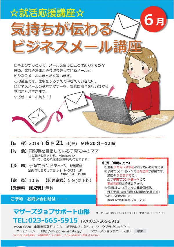 « すべてのイベント このイベントは終了しました。 気持ちが伝わるビジネスメール講座 2019年6月21日09:30 - 12:00 « パソコンお悩み相談室 パソコンお悩み相談室 » チラシはこちらからダウンロードできます + Google カレンダー+ iCal エクスポート 詳細 日付: 2019年6月21日 時間: 09:30 - 12:00 イベントカテゴリー: 団体主催 主催者 マザーズジョブサポート山形 電話番号: 023-665-5915 Web サイト: http://m-job.yamagata.jp/ 会場 子育てランドあ~べ 研修室 山形県山形市七日町1-1-1 N-GATE 1階 + Google マップ 電話番号: 023-615-1930
