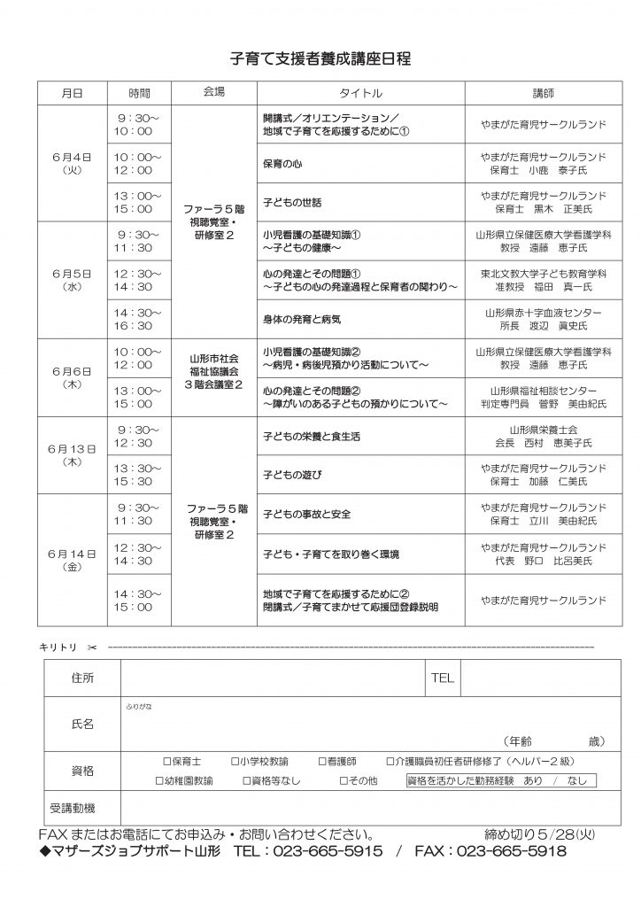 « すべてのイベント このイベントは終了しました。 子育て支援者養成講座 2019年6月13日09:30 - 15:30 « 子ども食堂・地域食堂「楽(らく)」 仕事理解セミナー » チラシはこちらからダウンロードできます + Google カレンダー+ iCal エクスポート 詳細 日付: 2019年6月13日 時間: 09:30 - 15:30 イベントカテゴリー: 団体主催 主催者 マザーズジョブサポート山形 電話番号: 023-665-5915 Web サイト: http://m-job.yamagata.jp/ 会場 山形市男女共同参画センター「ファーラ」 5階視聴覚室 城西町2ー2ー22 山形市, 山形県 990-0832 日本 + Google マップ