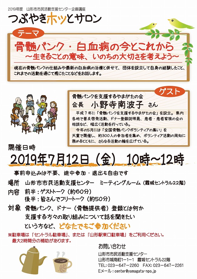 « すべてのイベント このイベントは終了しました。 つぶやきホッとサロン 2019年7月12日10:00 - 12:00 « NPOと行政の対話フォーラム ’19 「水辺の生き物みつけてみっべ」夏の自然観察会 » チラシはこちらからダウンロードできます(PDFデータ) + Google カレンダー+ iCal エクスポート 詳細 日付: 2019年7月12日 時間: 10:00 - 12:00 イベントカテゴリー: センター主催 主催者 山形市市民活動支援センター 電話番号: 023-647-2260 Web サイト: https://www.yamagata-npo.jp/ 会場 山形市市民活動支援センター ミーティングルーム