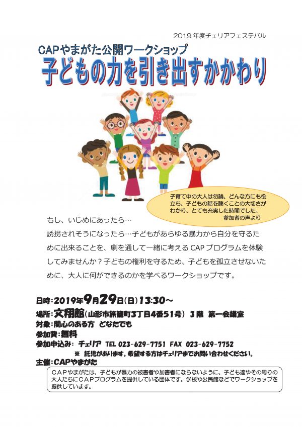 « すべてのイベント このイベントは終了しました。 CAPやまがた公開ワークショップ~子どもの力を引き出すかかわり~ 2019年9月29日13:30 - 15:00 « パパと赤ちゃんのためのベビーボンディング 家庭と仕事の両立を目指すママたちへ「賢い働き方を身につけよう~人生100年時代をいきいきと生きるために~ » チラシはこちらからダウンロードできます(PDFデータ) + Google カレンダー+ iCal エクスポート 詳細 日付: 2019年9月29日 時間: 13:30 - 15:00 イベントカテゴリー: 団体主催 主催者 CAPやまがた 会場 文翔館 3階 第一会議室