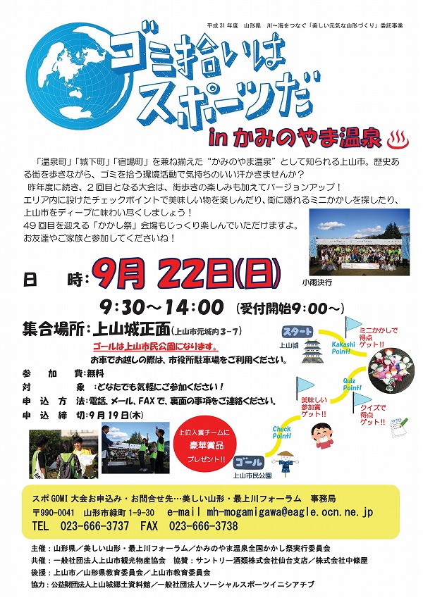 « すべてのイベント このイベントは終了しました。 ゴミ拾いはスポーツだinかみのやま温泉 2019年9月22日09:30 - 14:00 « 忘れても一人ひとりが主人公~認知症になっても安心して暮らせる社会を~ 大切な人を亡くした方のためのわかちあいの会 » チラシはこちらからダウンロードできます(PDFデータ) + Google カレンダー+ iCal エクスポート 詳細 日付: 2019年9月22日 時間: 09:30 - 14:00 イベントカテゴリー: 団体主催 主催者 美しい山形・最上川フォーラム 電話番号: 023-666-3737 Web サイト: http://www.mogamigawa.gr.jp/ 会場 上山城正面 上山市元城内3-7 + Google マップ