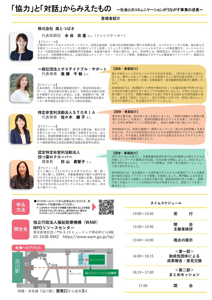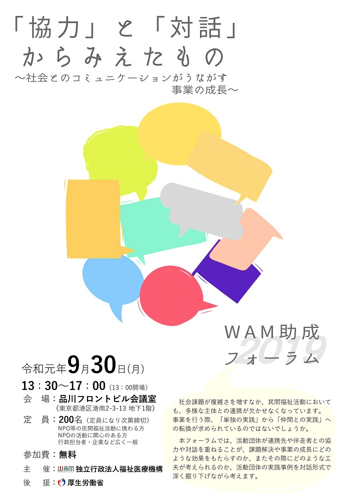 « すべてのイベント このイベントは終了しました。 WAM助成フォーラム2019 「協力」と「対話」からみえたもの ~社会とのコミュニケーションがうながす事業の成長~ 2019年9月30日13:30 - 17:00 無料 « 家庭と仕事の両立を目指すママたちへ「賢い働き方を身につけよう~人生100年時代をいきいきと生きるために~ 子ども食堂・地域食堂「楽(らく)」 » チラシはこちらからダウンロードできます(PDFデータ) + Google カレンダー+ iCal エクスポート 詳細 日付: 2019年9月30日 時間: 13:30 - 17:00 参加費: 無料 イベントカテゴリー: 団体主催 Web サイト: https://www.wam.go.jp/hp/r1_wam_josei_forum/ 主催者 独立行政法人福祉医療機構 NPOリソースセンター 電話番号: 03-3438-9942 Web サイト: http://www.wam.go.jp/hp/ 会場 品川フロントビル会議室 東京都港区港南2-3-13 地下1階 + Google マップ