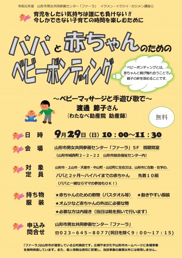 « すべてのイベント このイベントは終了しました。 パパと赤ちゃんのためのベビーボンディング 2019年9月29日10:00 - 11:30 « チェリアフェスティバル山形2019 CAPやまがた公開ワークショップ~子どもの力を引き出すかかわり~ » チラシはこちらからダウンロードできます(PDFデータ) + Google カレンダー+ iCal エクスポート 詳細 日付: 2019年9月29日 時間: 10:00 - 11:30 イベントカテゴリー: 団体主催 主催者 山形市男女共同参画センター ファーラ 電話番号: 023-645-8077 会場 山形市男女共同参画センター ファーラ 5階 視聴覚室 山形県山形市城西町2-2-22 山形市総合福祉センター内 山形市, 山形県 9900832 日本 + Google マップ