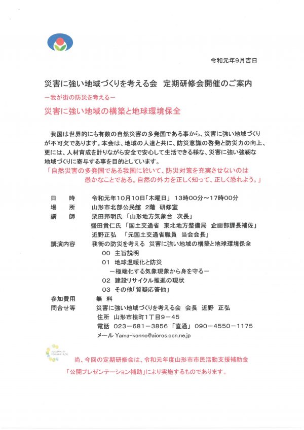 « すべてのイベント このイベントは終了しました。 災害に強い地域づくりを考える会 定期研修会 -我が街の防災を考える- 2019年10月10日13:00 - 17:00 « 山形国際ドキュメンタリー映画祭2019 支え合いの地域づくり担い手養成講座~トライアルの振り返りと次のアクションに向けて~ » チラシはこちらからダウンロードできます(PDFデータ) + Google カレンダー+ iCal エクスポート 詳細 日付: 2019年10月10日 時間: 13:00 - 17:00 イベントカテゴリー: 団体主催 主催者 災害に強い地域づくりを考える会 電話番号: 090-4550-1175 メール: yama-konno@aioros.ocn.jp 会場 山形市北部公民館 2階 研修室