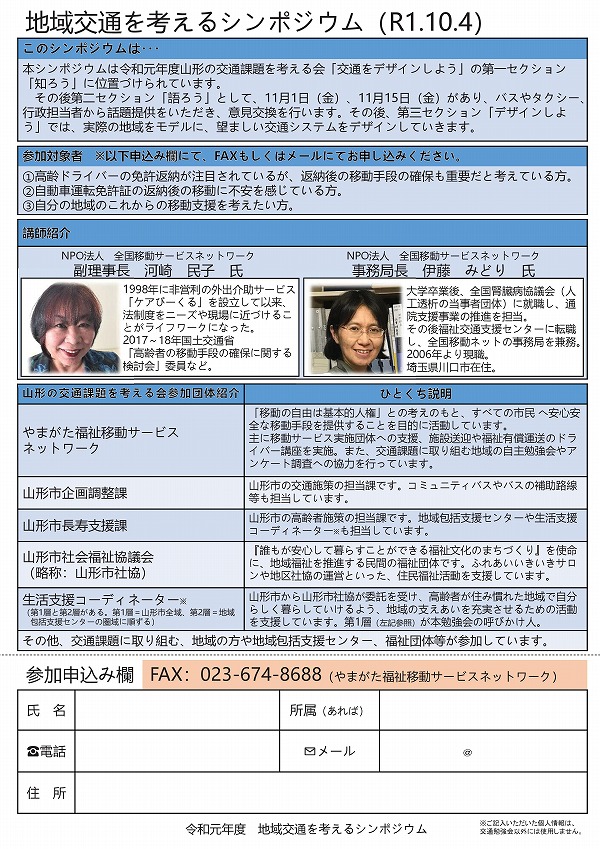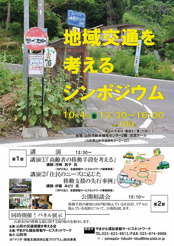 « すべてのイベント このイベントは終了しました。 地域交通を考えるシンポジウム 2019年10月4日13:30 - 16:00 « リア塾 秋は和菓子、老舗の技 子ども食堂・地域食堂「楽(らく)」 » チラシはこちらからダウンロードできます(PDFデータ) + Google カレンダー+ iCal エクスポート 詳細 日付: 2019年10月4日 時間: 13:30 - 16:00 イベントカテゴリー: 団体主催 主催者 やまがた福祉移動サービスネットワーク 電話番号: 023-623-6613 Web サイト: https://idonet-yamagata.jimdo.com/ 会場 山形市総合福祉センター2階交流ホール 城西町2-2-22 山形市, + Google マップ