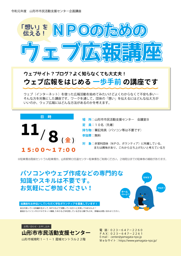 « すべてのイベント このイベントは終了しました。 【募集終了】NPOのためのウェブ広報講座 2019年11月8日15:00 - 17:00 « つぶやきホッとサロン 初心者向け古文書解読講座~五人組御仕置帳を読む~ » 【当講座は定員となりました】 チラシはこちらからご覧になれます(PDF形式) + Google カレンダー+ iCal エクスポート 詳細 日付: 2019年11月8日 時間: 15:00 - 17:00 イベントカテゴリー: センター主催 主催者 山形市市民活動支援センター 電話番号: 023-647-2260 Web サイト: https://www.yamagata-npo.jp/ 会場 山形市市民活動支援センター 会議室B 城南町1-1-1 霞城セントラル 山形市, 山形県 9908580 日本 + Google マップ 電話番号: 023-647-2260