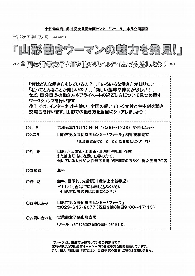 « すべてのイベント このイベントは終了しました。 「山形働きウーマンの魅力を発見!」~全国の営業女子とITを使いリアルタイムで交流しよう!~ 2019年11月10日10:00 - 12:00 « 第8期山形県要約筆記者養成講座 令和元年度 女性の人材育成事業 チェリア塾専門コース » チラシはこちらからダウンロードできます(PDFデータ) + Google カレンダー+ iCal エクスポート 詳細 日付: 2019年11月10日 時間: 10:00 - 12:00 イベントカテゴリー: 団体主催 主催者 営業部女子課山形支局 メール: yamagata@eigyobu-joshika.jp 会場 山形市男女共同参画センター ファーラ 5階 視聴覚室 山形県山形市城西町2-2-22 山形市総合福祉センター内 山形市, 山形県 9900832 日本 + Google マップ