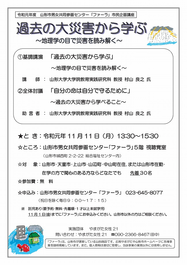 « すべてのイベント このイベントは終了しました。 過去の大災害から学ぶ ~地理学の目で災害を読み解く~ 2019年11月11日13:30 - 15:30 « 骨髄バンクボランティア「ドナー登録説明員」募集 子ども食堂・地域食堂「楽(らく)」 » チラシはこちらからダウンロードできます(PDFデータ) + Google カレンダー+ iCal エクスポート 詳細 日付: 2019年11月11日 時間: 13:30 - 15:30 イベントカテゴリー: 団体主催 主催者 やまがた女性21 電話番号: 090-2366‐8467 会場 山形市男女共同参画センター ファーラ 5階 視聴覚室 山形県山形市城西町2-2-22 山形市総合福祉センター内 山形市, 山形県 9900832 日本 + Google マップ