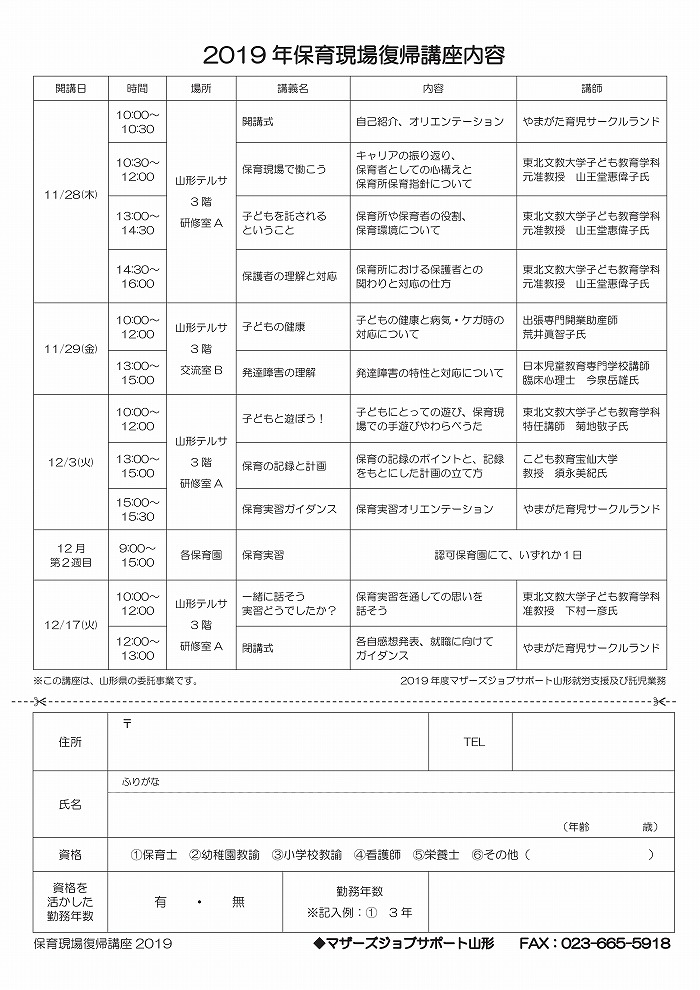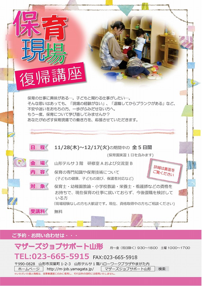 « すべてのイベント このイベントは終了しました。 保育現場復帰講座 2019年11月29日10:00 - 15:00 « やまがたウーマノミクス・ネットワークフォーラム 外国人・支援者対象 2019年度 村山地区第2回法律勉強会 » チラシはこちらからダウンロードできます(PDFデータ) + Google カレンダー+ iCal エクスポート 詳細 日付: 2019年11月29日 時間: 10:00 - 15:00 イベントカテゴリー: 団体主催 主催者 マザーズジョブサポート山形 電話番号: 023-665-5915 Web サイト: http://m-job.yamagata.jp/ 会場 山形テルサ 山形県山形市双葉町1-2-3 + Google マップ