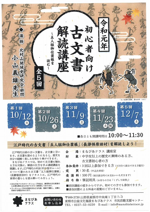 « すべてのイベント このイベントは終了しました。 初心者向け古文書解読講座~五人組御仕置帳を読む~ 2019年12月7日10:00 - 11:30 500円 « すぐ使える英会話 入門編 令和元年度 女性の人材育成事業 チェリア塾専門コース » チラシはこちらからダウンロードできます(PDFデータ) + Google カレンダー+ iCal エクスポート 詳細 日付: 2019年12月7日 時間: 10:00 - 11:30 参加費: 500円 イベントカテゴリー: 団体主催 主催者 まなびあテラス 市民活動支援センター 電話番号: 0237-57-0230 Web サイト: http://www.manabiaterrace.jp 会場 まなびあテラス 講座室 東根市中央南1-7-3 + Google マップ