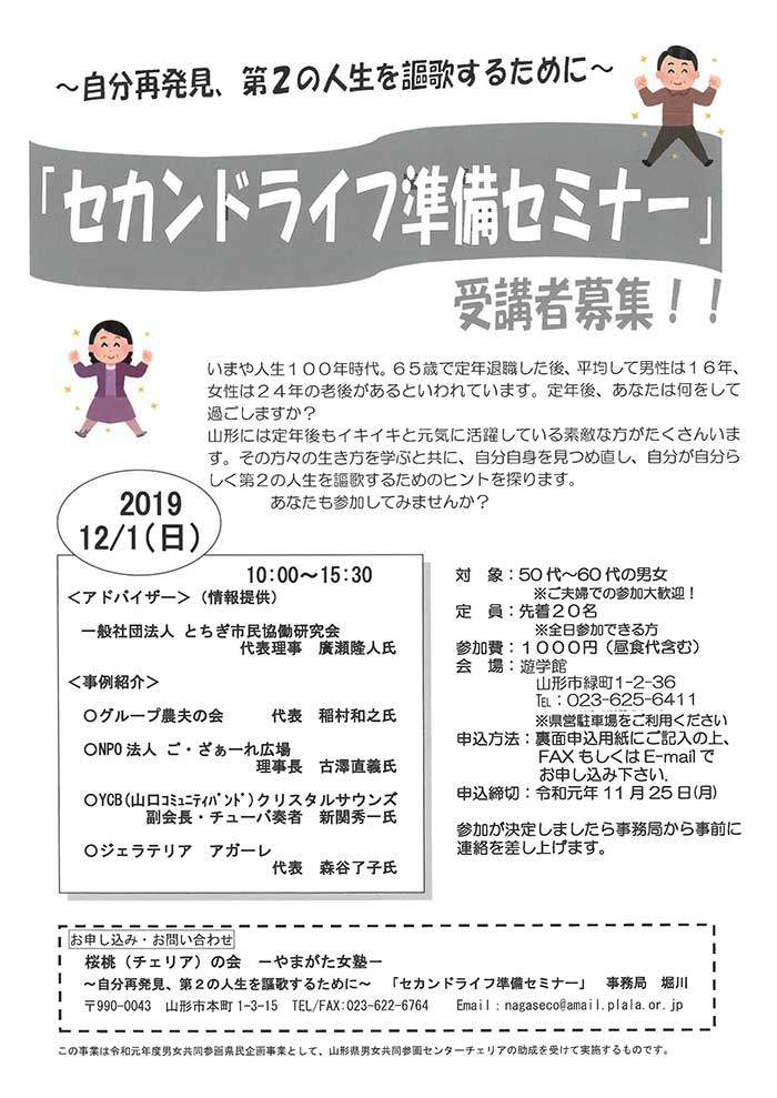 « すべてのイベント このイベントは終了しました。 ~自分再発見、第2の人生を謳歌するために~「セカンドライフ準備セミナー」 2019年12月1日10:00 - 15:30 1,000円 « 鈴川こども料理教室 たのしクッキング 保育現場復帰講座 » チラシはこちらからダウンロードできます(PDF形式) + Google カレンダー+ iCal エクスポート 詳細 日付: 2019年12月1日 時間: 10:00 - 15:30 参加費: 1,000円 イベントカテゴリー: 団体主催 会場 遊学館 緑町1-2-36 山形市, 山形県 日本 電話番号: 023-625-6411 Web サイト: https://www.gakushubunka.jp/yugakukan/ 主催者 桜桃(チェリア)の会 -やまがた女塾- 電話番号: 023-622-6764 メール: nagaseco @amail.plala.or.jp