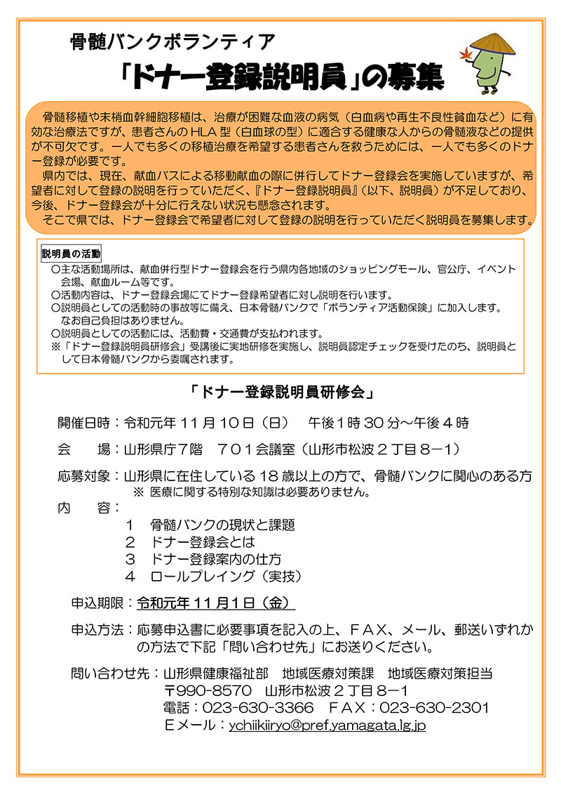 « すべてのイベント このイベントは終了しました。 骨髄バンクボランティア「ドナー登録説明員」募集 2019年11月10日13:30 - 16:00 « NPO勉強会 NPO法人の実務・設立編~法人になるまで~ 過去の大災害から学ぶ ~地理学の目で災害を読み解く~ » ・チラシ申込書PDFデータは、こちらからダウンロードすることができます + Google カレンダー+ iCal エクスポート 詳細 日付: 2019年11月10日 時間: 13:30 - 16:00 イベントカテゴリー: 団体主催 主催者 山形県健康福祉部地域医療対策課地域医療対策担当 会場 山形県庁 7階 701会議室 山形県山形市松波2丁目8−1 山形市, + Google マップ