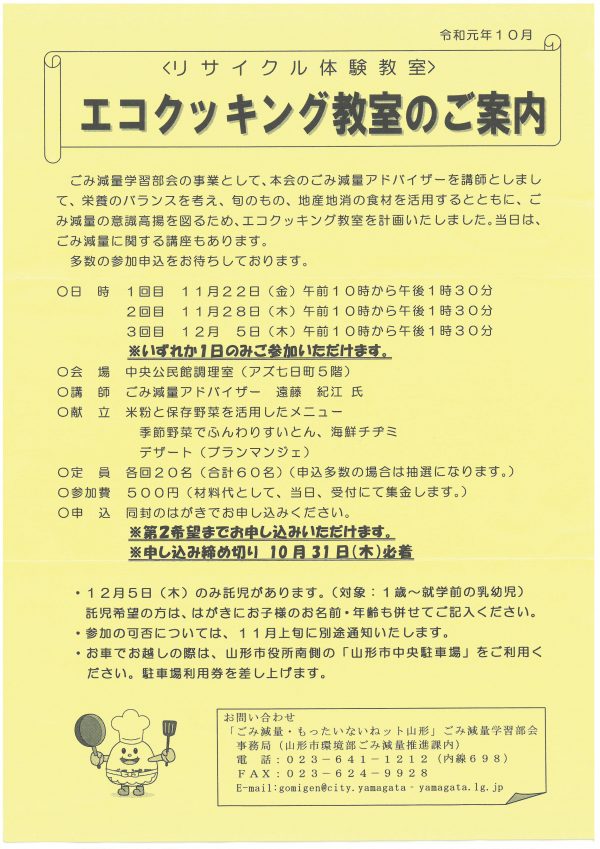 « すべてのイベント このイベントは終了しました。 エコクッキング教室 2019年11月28日10:00 - 13:30 « 保育現場復帰講座 やまがたウーマノミクス・ネットワークフォーラム » チラシはこちらからダウンロードできます(PDFデータ) + Google カレンダー+ iCal エクスポート 詳細 日付: 2019年11月28日 時間: 10:00 - 13:30 イベントカテゴリー: 団体主催 主催者 「ごみ減量・もったいないねット山形」ごみ減量学習部会 会場 中央公民館調理室(アズ七日町5階)