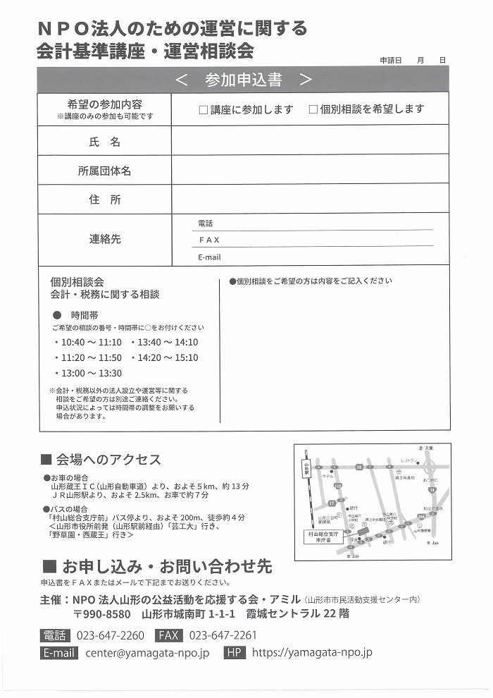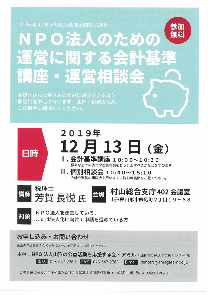 « すべてのイベント このイベントは終了しました。 NPO法人のための運営に関する会計基準講座・運営相談会 2019年12月13日10:00 - 15:10 « ママの不安を和らげよう すぐ使える英会話 応用編 » チラシはこちらからダウンロードできます(PDFデータ) + Google カレンダー+ iCal エクスポート 詳細 日付: 2019年12月13日 時間: 10:00 - 15:10 イベントカテゴリー: 団体主催 主催者 NPO法人山形の公益活動を応援する会・アミル 電話番号: 023-647-2260 メール: center@yamagata-npo.jp 会場 村山総合支庁402会議室 山形市鉄砲町2-19-68 + Google マップ
