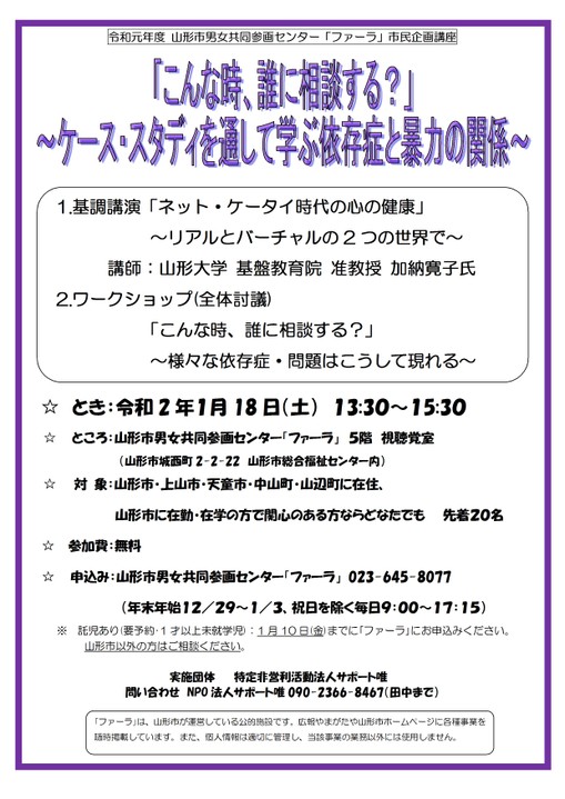 « すべてのイベント このイベントは終了しました。 「こんな時、誰に相談する?」~ケーススタディを通して学ぶ依存症と暴力の関係~ 2020年1月18日13:30 - 15:30 « 働く女性のためのビジネススキル基礎講座 第4回 第7回 柏倉門伝ぼんぼりまつり » チラシはこちらよりダウンロードできます(PDF形式) + Google カレンダー+ iCal エクスポート 詳細 日付: 2020年1月18日 時間: 13:30 - 15:30 イベントカテゴリー: 団体主催 主催者 NPO法人 サポート唯 電話番号: 090-2366-8467 会場 山形市男女共同参画センター 5階視聴覚室 山形市城西町2-2-22 山形市, + Google マップ