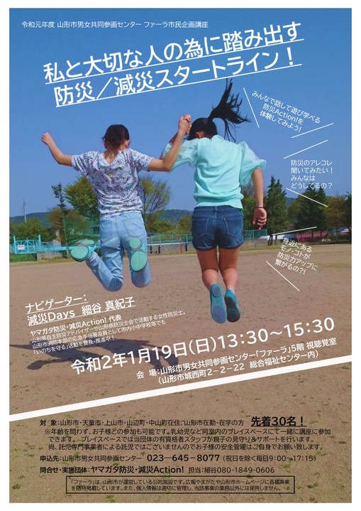 « すべてのイベント このイベントは終了しました。 私と大切な人の為に踏み出す 防災/減災スタートライン! 2020年1月19日13:30 - 15:30 « 第7回 柏倉門伝ぼんぼりまつり 仕事理解セミナー » チラシはこちらよりダウンロードできます。 + Google カレンダー+ iCal エクスポート 詳細 日付: 2020年1月19日 時間: 13:30 - 15:30 イベントカテゴリー: 団体主催 主催者 ヤマガタ防災・減災Action! 電話番号: 080-1849-0606 会場 山形市男女共同参画センター 5階視聴覚室 山形市城西町2-2-22 山形市, + Google マップ