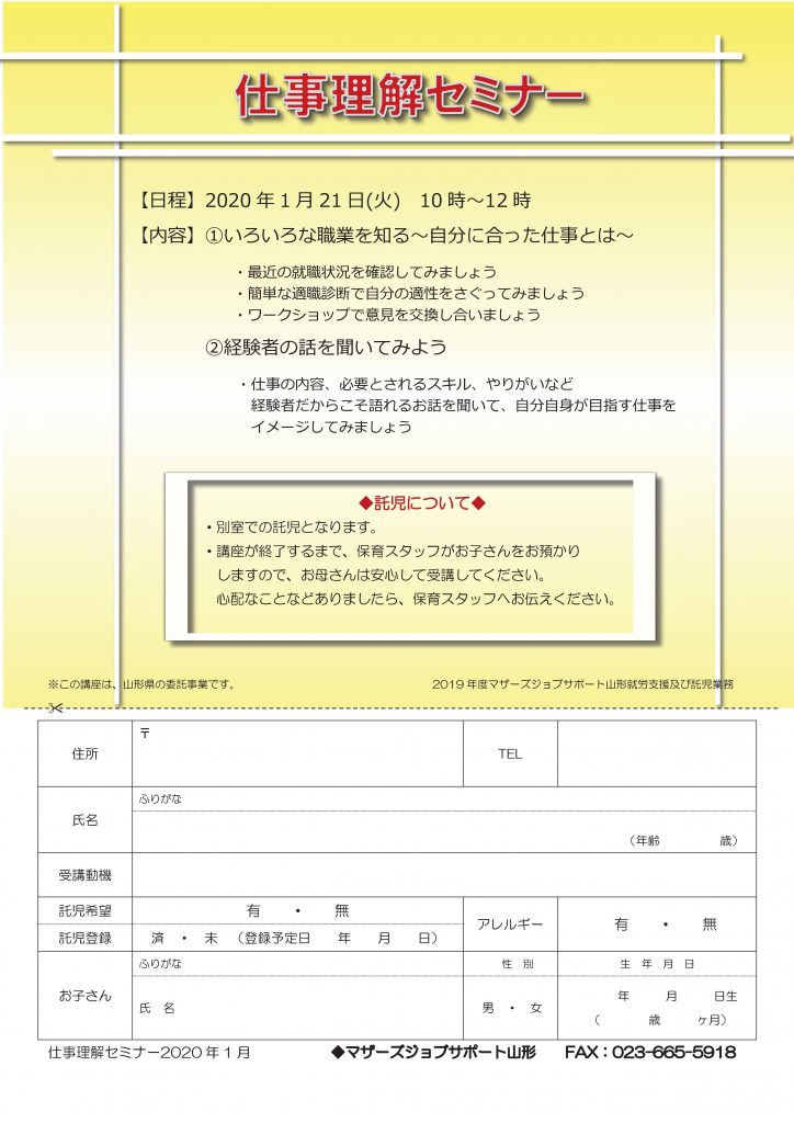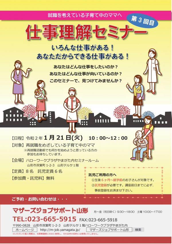 « すべてのイベント このイベントは終了しました。 仕事理解セミナー 2020年1月21日10:00 - 12:00 « 私と大切な人の為に踏み出す 防災/減災スタートライン! 秘伝豆の味噌作り » チラシはこちらからダウンロードできます(PDFデータ) + Google カレンダー+ iCal エクスポート 詳細 日付: 2020年1月21日 時間: 10:00 - 12:00 イベントカテゴリー: 団体主催 主催者 マザーズジョブサポート山形 電話番号: 023-665-5915 Web サイト: http://m-job.yamagata.jp/ 会場 ハローワークプラザやまがた内 セミナールーム 双葉町1-2-3 山形市, 山形県 9900828 + Google マップ