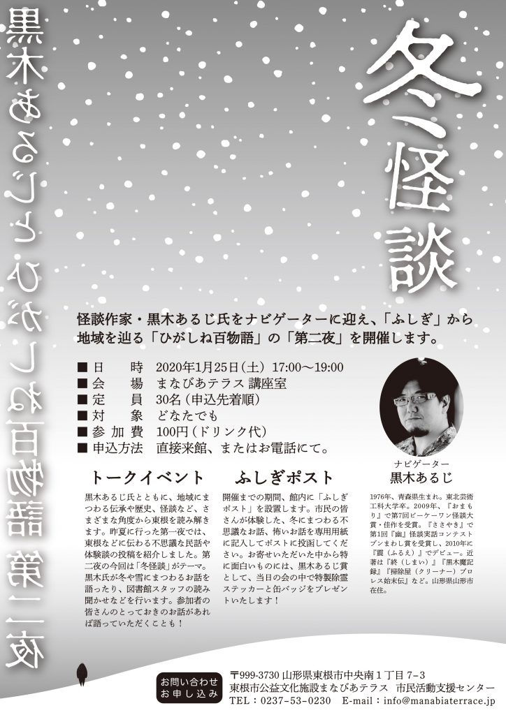 « すべてのイベント このイベントは終了しました。 黒木あるじとひがしね百物語 第二夜 冬怪談 2020年1月25日17:00 - 19:00 100円 « 地球温暖化防止講演会 気候変動とCOOLCHOICEの推進 3Dプリンター活用アイディアコンテスト » チラシはこちらからダウンロードできます(PDFデータ) + Google カレンダー+ iCal エクスポート 詳細 日付: 2020年1月25日 時間: 17:00 - 19:00 参加費: 100円 イベントカテゴリー: 団体主催 主催者 東根市公益文化施設まなびあテラス 市民活動支援センター 電話番号: 0237-53-0230 会場 まなびあテラス 講座室 東根市中央南1-7-3 + Google マップ