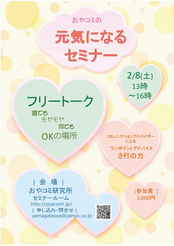« すべてのイベント このイベントは終了しました。 おやコミの元気になるセミナー 2020年2月8日13:00 - 16:00 3,000円 « 令和元年度 第2回 子どもの居場所作り研修会 秘伝豆の納豆作り » チラシはこちらからダウンロードできます(PDFデータ) + Google カレンダー+ iCal エクスポート 詳細 日付: 2020年2月8日 時間: 13:00 - 16:00 参加費: 3,000円 イベントカテゴリー: 団体主催 Web サイト: http://oyacomi.jp/log/?l=480645 主催者 おやコミ研究所 メール: yamagataoya@yahoo.co.jp 会場 おやコミ研究所 セミナールーム【蔵】