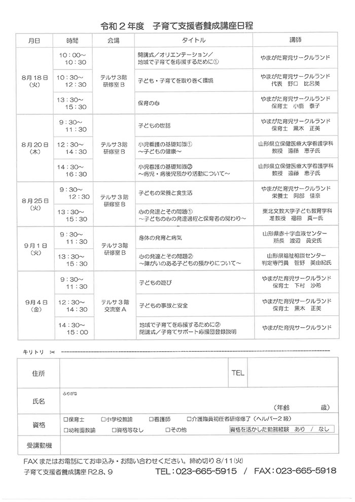 « すべてのイベント このイベントは終了しました。 子育て支援者育成講座 2020年9月1日09:30 - 15:30 « 音楽ひろば ぺんたとおん 伝えるから伝わるへ 思いが届くコミュニケーション » チラシはこちらからダウンロードできます(PDF) + Google カレンダー+ iCal エクスポート 詳細 日付: 2020年9月1日 時間: 09:30 - 15:30 イベントカテゴリー: 団体主催 主催者 マザーズジョブサポート山形 電話番号: 023-665-5915 Web サイト: http://m-job.yamagata.jp/ 会場 山形テルサ3階 研修室B 双葉町1-2-3 山形市, 山形県 9900828 日本 + Google マップ