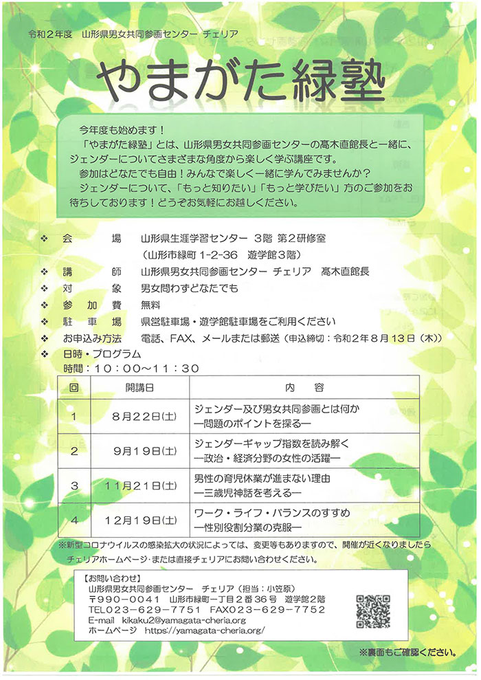 « すべてのイベント このイベントは終了しました。 令和2年度 やまがた緑塾 第3回「男の育児休業が進まない理由」 2020年11月21日10:00 - 11:30 « NPOよろず相談会 市民企画講座「おもしゃいごどみっけ!子どもも大人も紙芝居・絵本・シナプソロジーで」 » チラシはこちらからダウンロードできます(PDF) + Google カレンダー+ iCal エクスポート 詳細 日付: 2020年11月21日 時間: 10:00 - 11:30 イベントカテゴリー: 団体主催 Web サイト: https://yamagata-cheria.org/ 主催者 山形県男女共同参画センター チェリア 電話番号: 023-629-7751 メール: cheria1@yamagata-cheria.org Web サイト: https://www.yamagata-cheria.org/ 会場 山形生涯学習センター3階第2研究室 緑町1-2-36 山形市, 山形県 9900041 日本 + Google マップ
