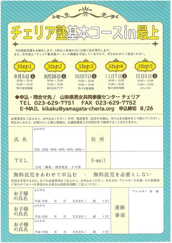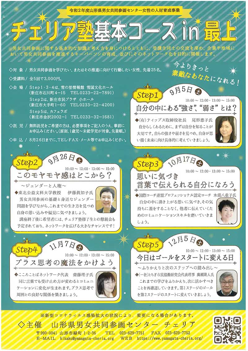 « すべてのイベント このイベントは終了しました。 チェリア塾基本コースin最上 2020年9月26日10:00 - 15:00 3000円 « 知っていると約に立つ女性のための労働法令基礎知識 ようこそいらっしゃいました。心からかんしゃしてます。ぼくのさくひんてんにきてください。みなさんから見てください展 あ~と工務店vol.2 » チラシはこちらからダウンロードできます(PDF) ◇申込締切:8月26日 ◇受講料 :全5回で3,000円 + Google カレンダー+ iCal エクスポート 詳細 日付: 2020年9月26日 時間: 10:00 - 15:00 参加費: 3000円 イベントカテゴリー: 団体主催 Web サイト: https://yamagata-cheria.org/index.php?_restful_permalink=bb1xmjwzv-220/#_220 主催者 山形県男女共同参画センター チェリア 電話番号: 023-629-7751 メール: cheria1@yamagata-cheria.org Web サイト: https://www.yamagata-cheria.org/ 会場 新庄市民プラザ小ホール 大手町1-60 新庄市, 山形県 日本 + Google マップ