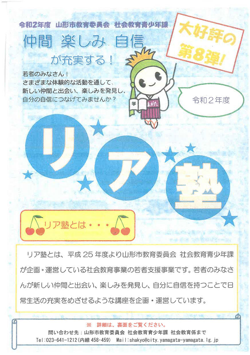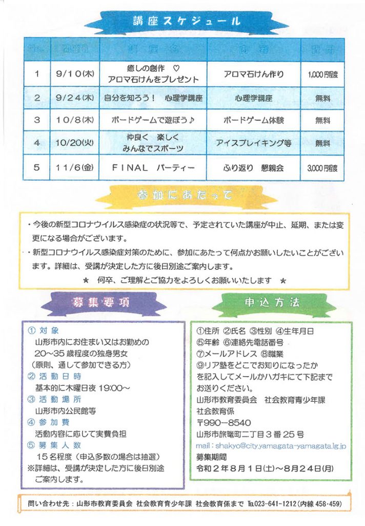« すべてのイベント このイベントは終了しました。 リア塾 自分を知ろう!心理学講座 2020年9月24日19:00 « COOL CHOICE&防災展 ☆就活応援講座☆ 事務入門に挑戦 ワードを体験しよう! » チラシはこちらからダウンロードできます(PDF) 会場の詳細は主催者までお問合せください + Google カレンダー+ iCal エクスポート 詳細 日付: 2020年9月24日 時間: 19:00 イベントカテゴリー: 団体主催 主催者 山形市教育委員会 社会教育青年課 社会教育係 電話番号: 023-641-1212(内線458・459) メール: shakyo@city.yamagata-yamagata.lg.jp
