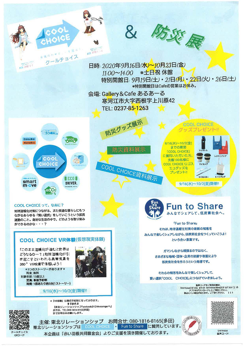 « すべてのイベント このイベントは終了しました。 COOL CHOICE&防災展 2020年9月23日11:00 - 14:00 « ようこそいらっしゃいました。心からかんしゃしてます。ぼくのさくひんてんにきてください。みなさんから見てください展 あ~と工務店vol.2 【市民のための環境公開講座(通年講座)】パート1:生きものと気候変動「真のパラダイムシフトで地球環境を守ろう!」 » チラシはこちらからダウンロードできます(PDFデータ) + Google カレンダー+ iCal エクスポート 詳細 日付: 2020年9月23日 時間: 11:00 - 14:00 イベントカテゴリー: 団体主催 主催者 東北リレーションシップ 会場 Gallery&Cafeあるあーる 大字西根字上川原42番地 寒河江市, 山形県 Japan + Google マップ