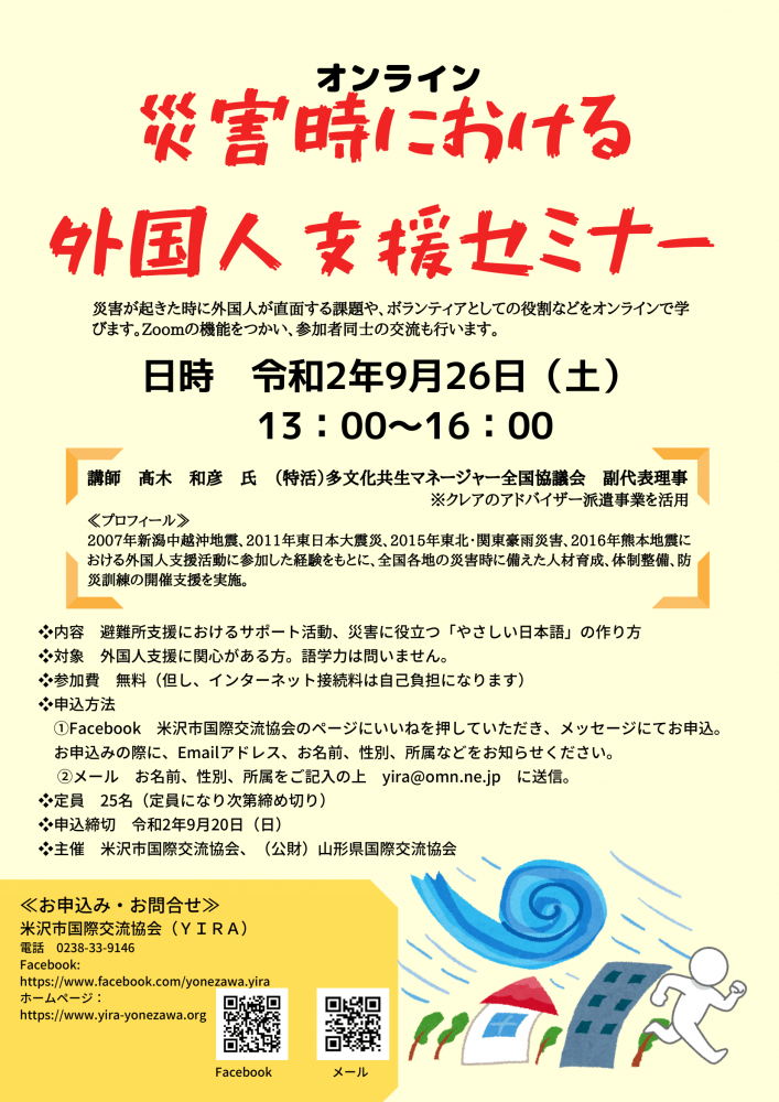 « すべてのイベント このイベントは終了しました。 オンライン 災害時における外国人支援セミナー 2020年9月26日13:00 - 18:00 « COOL CHOICE&防災展 【満員御礼】地方都市のSDGs ~「市民×地域団体×NPO×行政」で切り開くまちの未来とは?~ » チラシはこちらよりダウンロードできます + Google カレンダー+ iCal エクスポート 詳細 日付: 2020年9月26日 時間: 13:00 - 18:00 イベントカテゴリー: 団体主催 主催者 米沢市国際交流協会、(公財)山形県国際交流協会 電話番号: 0238-33-9146 Web サイト: https://www.yira-yonezawa.org/ 会場 オンライン開催