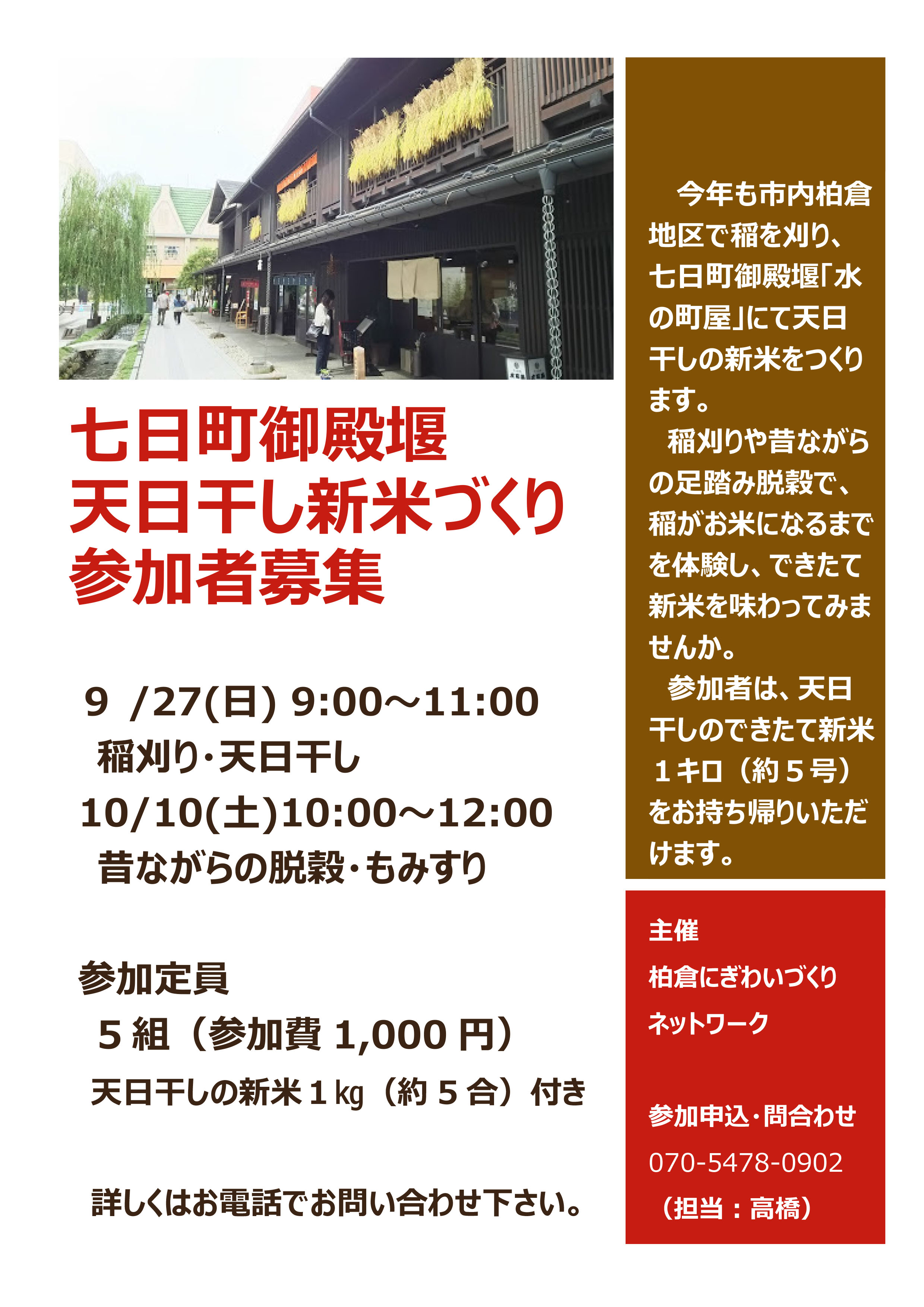 « すべてのイベント このイベントは終了しました。 七日町御殿堰天日干し新米づくり 2020年9月27日09:00 - 11:00 « 【満員御礼】地方都市のSDGs ~「市民×地域団体×NPO×行政」で切り開くまちの未来とは?~ ぷらいずバザー » チラシはこちらからダウンロードできます + Google カレンダー+ iCal エクスポート 詳細 日付: 2020年9月27日 時間: 09:00 - 11:00 イベントカテゴリー: 団体主催 主催者 柏倉にぎわいづくりネットワーク 電話番号: 070-5478-0902 会場 山形市七日町御殿堰(水の町屋前)