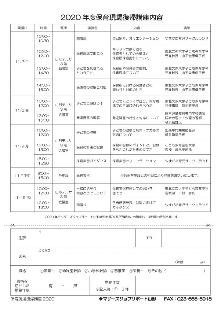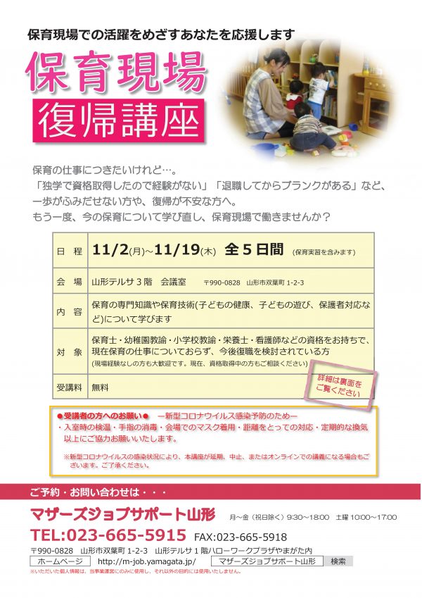 « すべてのイベント このイベントは終了しました。 保育現場復帰講座 「一緒に話そう実習どうでしたか?」「閉講式」 2020年11月19日10:00 - 13:00 « SDGsミーティング@山形市市民活動支援センター DV防止講座「性暴力のない社会に~身近な人を守るために学んでおくこと~」 » チラシはこちらからダウンロードできます(PDFデータ) + Google カレンダー+ iCal エクスポート 詳細 日付: 2020年11月19日 時間: 10:00 - 13:00 イベントカテゴリー: 団体主催 Web サイト: http://m-job.yamagata.jp/log/?l=490837 主催者 マザーズジョブサポート山形 電話番号: 023-665-5915 Web サイト: http://m-job.yamagata.jp/ 会場 山形テルサ3階 会議室 双葉町1-2-3 山形市, 山形県 990-0828 + Google マップ