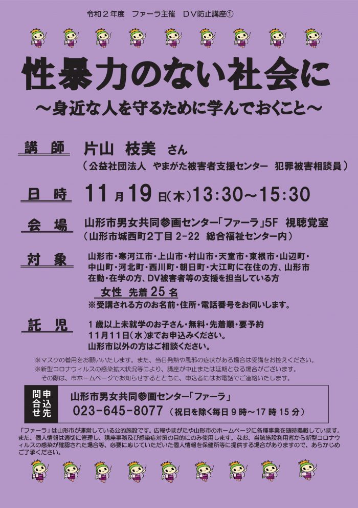 « すべてのイベント このイベントは終了しました。 DV防止講座「性暴力のない社会に~身近な人を守るために学んでおくこと~」 2020年11月19日13:30 - 15:30 « 保育現場復帰講座 「一緒に話そう実習どうでしたか?」「閉講式」 ☆就活応援講座☆ ひさしぶりのパソコン 不安を解消しよう! » チラシはこちらからダウンロードできます(PDFデータ) + Google カレンダー+ iCal エクスポート 詳細 日付: 2020年11月19日 時間: 13:30 - 15:30 イベントカテゴリー: 団体主催 Web サイト: https://www.city.yamagata-yamagata.lg.jp/kakuka/kikaku/danjosenta/ibento/dvbousikouza.html 主催者 山形市男女共同参画センター「ファーラ」 電話番号: 023-645-8077 会場 山形市男女共同参画センター「ファーラ」5F 視聴覚室 城西町2ー2ー22 山形市, 山形県 990-0828 + Google マップ 電話番号: 023-645-8077