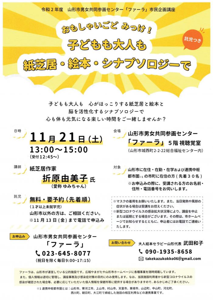 « すべてのイベント このイベントは終了しました。 市民企画講座「おもしゃいごどみっけ!子どもも大人も紙芝居・絵本・シナプソロジーで」 2020年11月21日13:00 - 15:00 « 令和2年度 やまがた緑塾 第3回「男の育児休業が進まない理由」 かぜのメリーゴーランド » チラシはこちらからダウンロードできます + Google カレンダー+ iCal エクスポート 詳細 日付: 2020年11月21日 時間: 13:00 - 15:00 イベントカテゴリー: 団体主催 Web サイト: https://www.city.yamagata-yamagata.lg.jp/kakuka/kikaku/danjosenta/ibento/siminkikakuotona.html 主催者 山形市男女共同参画センター「ファーラ」 電話番号: 023-645-8077 会場 山形市男女共同参画センター 5階視聴覚室 山形市城西町2-2-22 山形市, + Google マップ