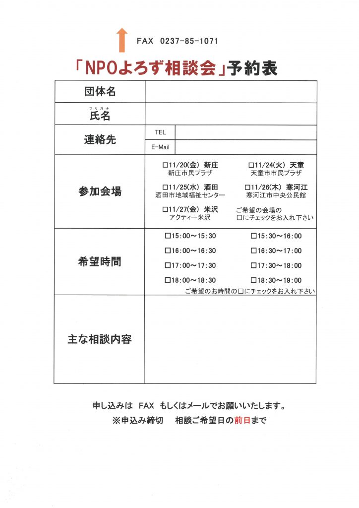 « すべてのイベント このイベントは終了しました。 NPOよろず相談会 2020年11月20日15:00 - 19:00 « DVという名の支配~DVが心に及ぼす影響とその対策~ 令和2年度 やまがた緑塾 第3回「男の育児休業が進まない理由」 » チラシはこちらからダウンロードできます(PDFデータ) + Google カレンダー+ iCal エクスポート 詳細 日付: 2020年11月20日 時間: 15:00 - 19:00 イベントカテゴリー: 団体主催 主催者 特定非営利活動法人 やまがた絆の架け橋ネットワーク 電話番号: 0237-85-1070 メール: info@kakehasi.jpn.org Web サイト: http://kakehasi.jpn.org/ 会場 新庄市民プラザ 2階 第2研修室 大手町1-60 新庄市, 山形県 996-0084 + Google マップ 電話番号: 0233-22-4200