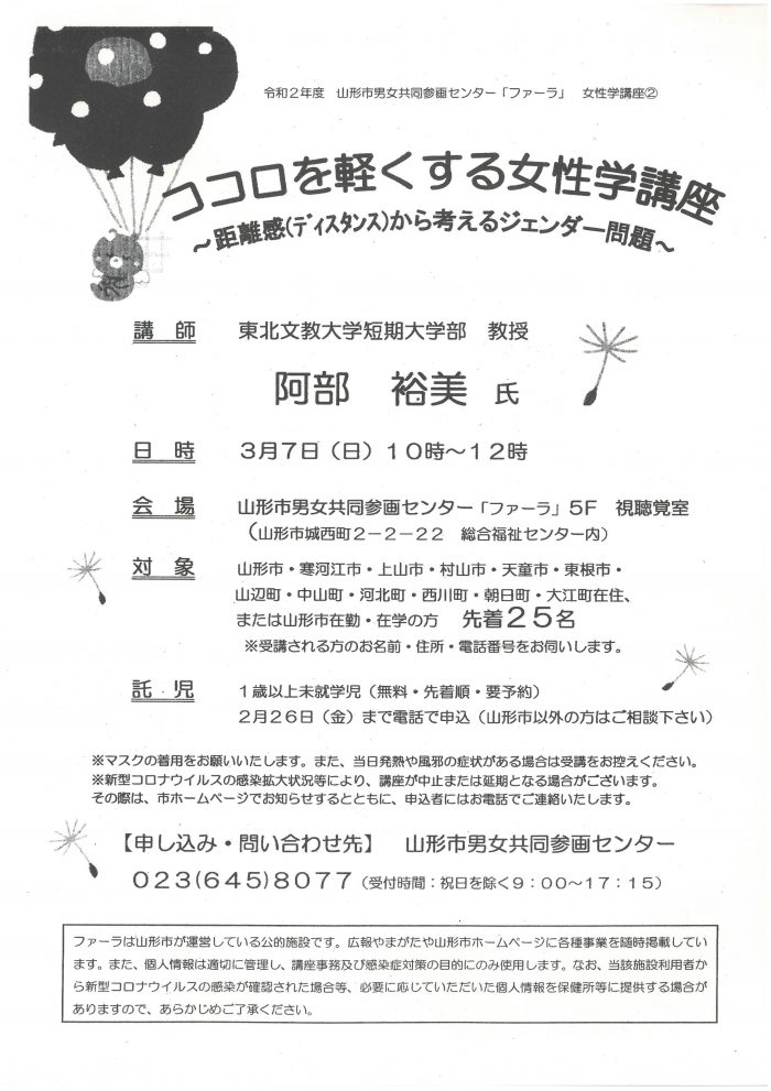 « すべてのイベント このイベントは終了しました。 ココロを軽くする女性学講座~距離感(ディスタンス)から考えるジェンダー問題~ 2021年3月7日10:00 - 12:00 « 家族の関係が一目でわかる! コミュニケーションマップってなぁに? Youtuber看護師隊員が語る ラオスでのコロナ禍の協力隊活動! » チラシはこちらからダウンロードできます(PDFデータ) + Google カレンダー+ iCal エクスポート 詳細 日付: 2021年3月7日 時間: 10:00 - 12:00 イベントカテゴリー: 団体主催 主催者 山形市男女共同参画センター 電話番号: 023-645-8077 会場 山形市男女共同参画センター「ファーラ」5F 視聴覚室 城西町2ー2ー22 山形市, 山形県 990-0828 + Google マップ 電話番号: 023-645-8077
