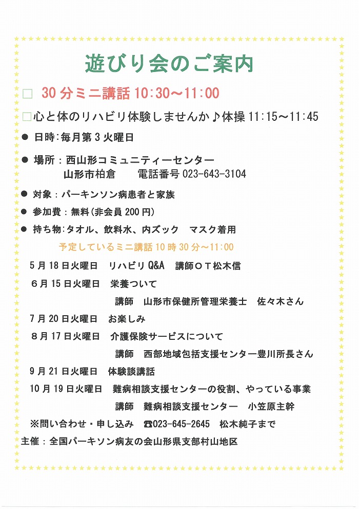 « すべてのイベント このイベントは終了しました。 遊びり会 2021年8月17日10:30 - 11:45 200円(会員無料) « 野良猫の相談会 ママが知っておきたいお金とキャリアのはなし<オンラインセミナー> » チラシのPDFはこちらからダウンロードできます + Google カレンダー+ iCal エクスポート 詳細 日付: 2021年8月17日 時間: 10:30 - 11:45 参加費: 200円(会員無料) イベントカテゴリー: 団体主催 主催者 全国パーキンソン病友の会山形県支部村山地区 会場 西山形コミュニティセンター 山形市柏倉3800 + Google マップ