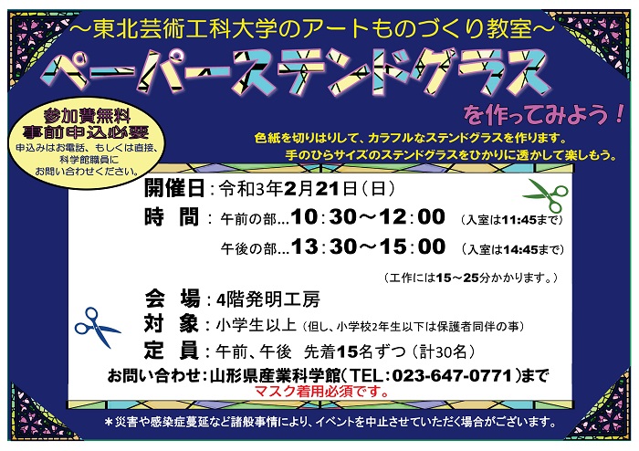« すべてのイベント このイベントは終了しました。 ~東北芸術工科大学のアートものづくり教室~ ペーパーステンドグラスを作ってみよう! 2021年2月21日10:30 - 12:00 無料 « 第13回やまがた市民活動まつり ~つなげよう活動の輪~ withコロナ ~東北芸術工科大学のアートものづくり教室~ ペーパーステンドグラスを作ってみよう! » + Google カレンダー+ iCal エクスポート 詳細 日付: 2021年2月21日 時間: 10:30 - 12:00 参加費: 無料 イベントカテゴリー: 団体主催 Web サイト: http://y-sunka.org/eventhot/155_index_msg.shtml 主催者 山形県産業科学館 電話番号: 023-647-0771 Web サイト: http://y-sunka.org/ 会場 山形県産業科学館4階発明工房 城南町1-1-1 山形市, 山形県 990-8580 + Google マップ