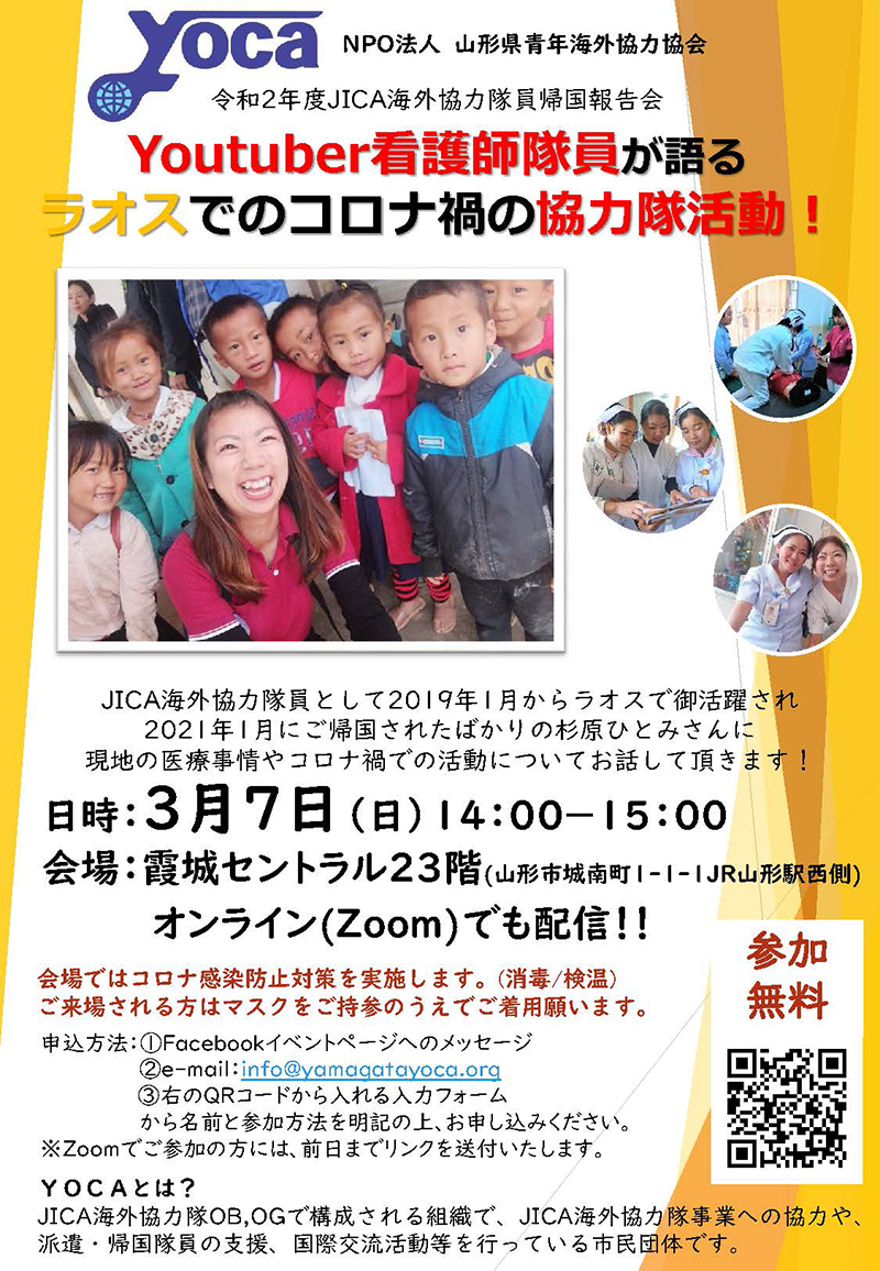 « すべてのイベント このイベントは終了しました。 Youtuber看護師隊員が語る ラオスでのコロナ禍の協力隊活動! 2021年3月7日14:00 - 15:00 « ココロを軽くする女性学講座~距離感(ディスタンス)から考えるジェンダー問題~ オンライン版つぶやきホッとサロン » チラシはこちらからダウンロードできます(PDFデータ) + Google カレンダー+ iCal エクスポート 詳細 日付: 2021年3月7日 時間: 14:00 - 15:00 イベントカテゴリー: 団体主催 主催者 山形県青年海外協力協会 メール: info@yamagatayoca.org 会場 山形市市民活動支援センター 23階 高度情報会議室 山形市城南町1-1-1 霞城セントラル23階 + Google マップ