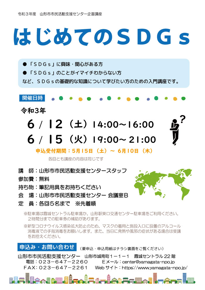« すべてのイベント このイベントは終了しました。 【満員御礼】はじめてのSDGs 2021年6月15日19:00 - 21:00 無料 « 遊びり会 転勤に負けない!キャリアと自分軸の作り方 » チラシのダウンロード(PDF) 申込書のダウンロード(PDF・word) ※申込受付期間:5月15日(土)~6月10日(木) この講座は定員に達した為、申込みを締切りました。 + Google カレンダー+ iCal エクスポート 詳細 日付: 2021年6月15日 時間: 19:00 - 21:00 参加費: 無料 イベントカテゴリー: センター主催 主催者 山形市市民活動支援センター 電話番号: 023-647-2260 Web サイト: https://www.yamagata-npo.jp/ 会場 山形市市民活動支援センター ふらっと + 会議室B 山形県山形市城南町1-1-1-22F + Google マップ 電話番号: 023-647-2260 Web サイト: https://www.yamagata-npo.jp/