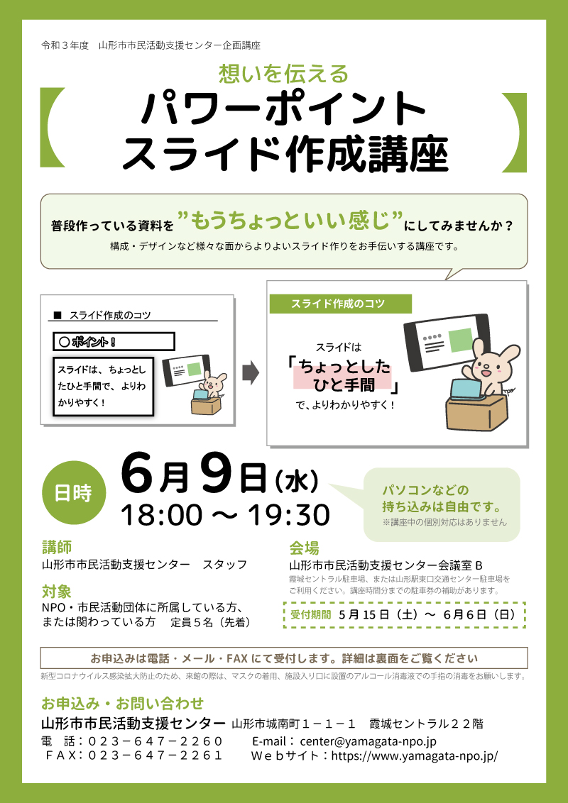 « すべてのイベント このイベントは終了しました。 想いを伝える パワーポイントスライド作成講座 2021年6月9日18:00 - 19:30 « 第2回YU-SDGsカフェ 【満員御礼】はじめてのSDGs » お申込受付期間:5月15日(土)~6月6日(日) チラシはこちらよりダウンロードできます(PDF形式) + Google カレンダー+ iCal エクスポート 詳細 日付: 2021年6月9日 時間: 18:00 - 19:30 イベントカテゴリー: センター主催 主催者 山形市市民活動支援センター 電話番号: 023-647-2260 Web サイト: https://www.yamagata-npo.jp/ 会場 山形市市民活動支援センター 会議室B 城南町1-1-1 霞城セントラル 山形市, 山形県 9908580 日本 + Google マップ 電話番号: 023-647-2260
